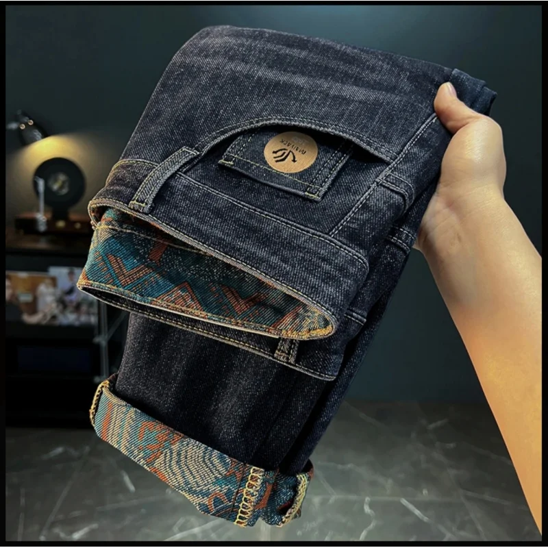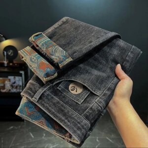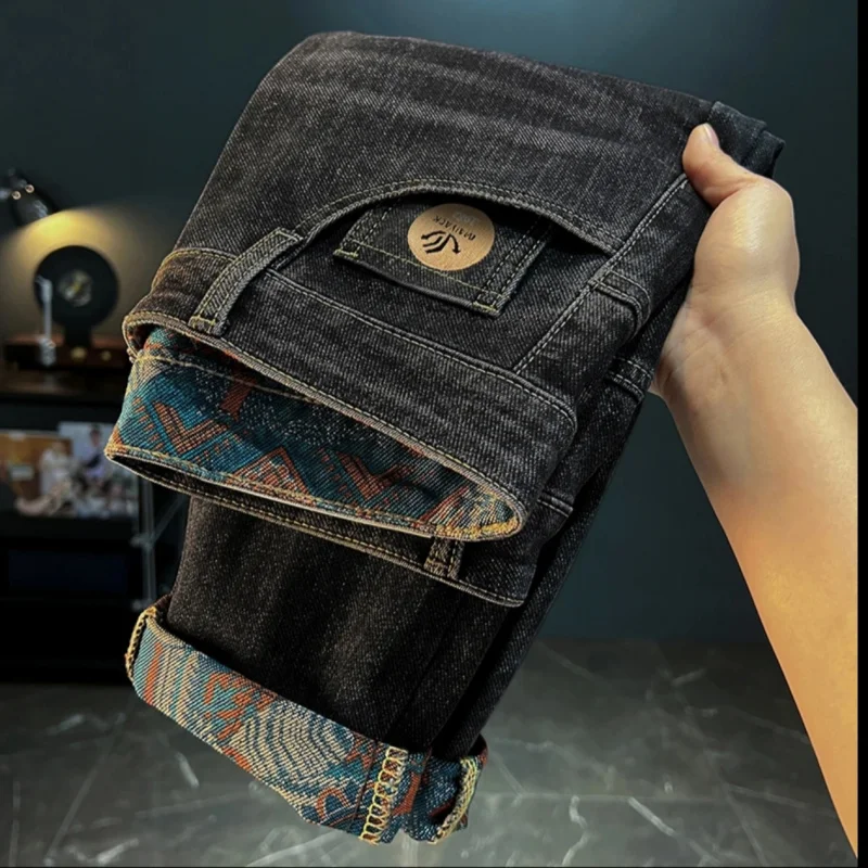 Retro ethnic style printed design jeans for men, 2026 autumn new men’s clothing, slim fit trend casual pants