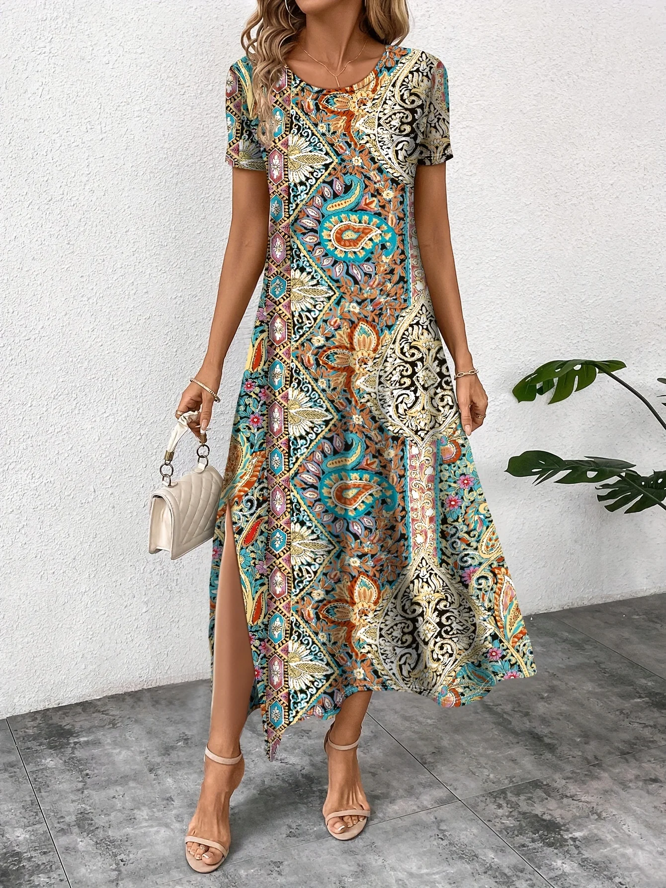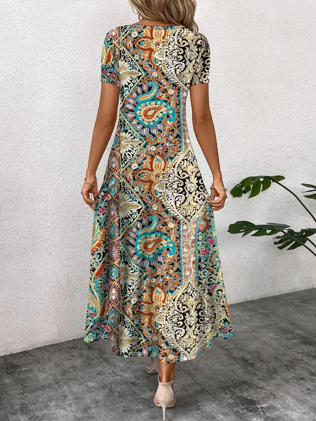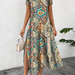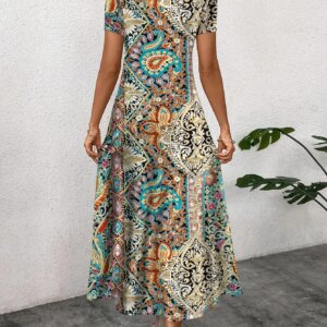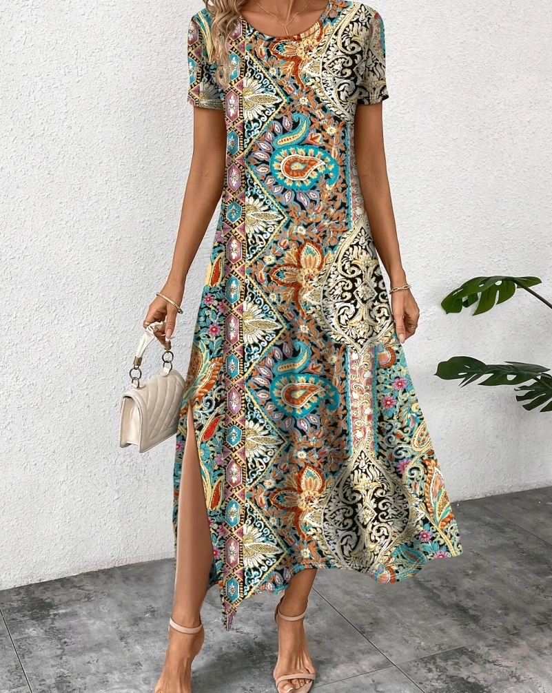 Elegant Casual Long Dress Boho Print Design Short Sleeve V Neck Summer Dress For Women 2024 Fashion