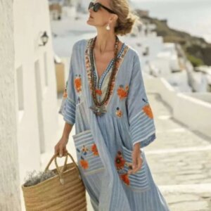 Be the first to review “New Summer Large-size Striped Print Long Large-spoke V-neck Dress Fashionable Casual Loose Elegant Pocket Dress Females” Cancel reply