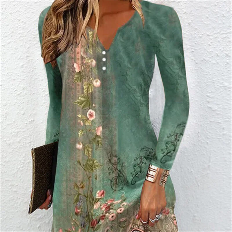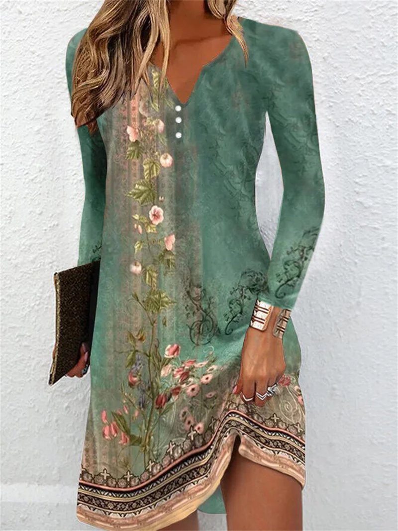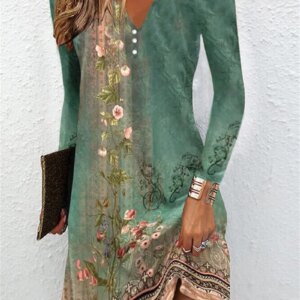 Women’s Floral Print Long Sleeve V-Neck Loose Fit Casual Dress