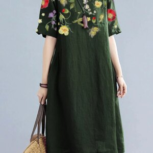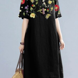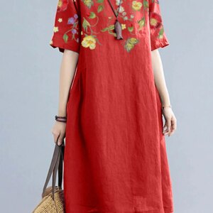 Women’s Vintage Dress Short Sleeve Round Neck Floral Printed Casual A-Line Loose Summer Midi Dress