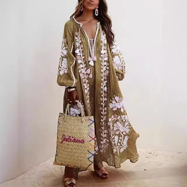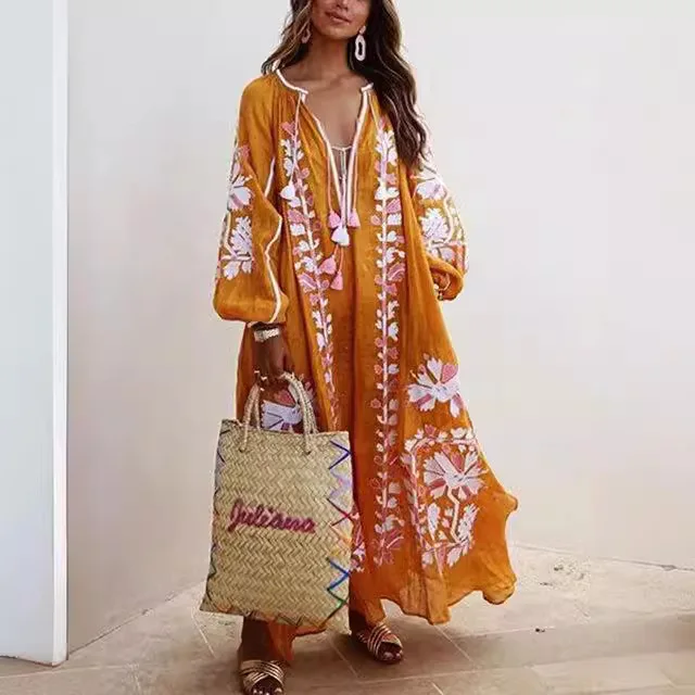 Be the first to review “Boho Elegant Print Long Dress For Women Loose Casual V Neck Lace Up Big Hem Long Style Dresses 2024 Fashion New Lady Robe” Cancel reply