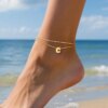 - double layer chain anklets for woman; shorter layer chain – – rolo chain with beads spacer ; longer layer chain — snake chain with chunky initial letter;