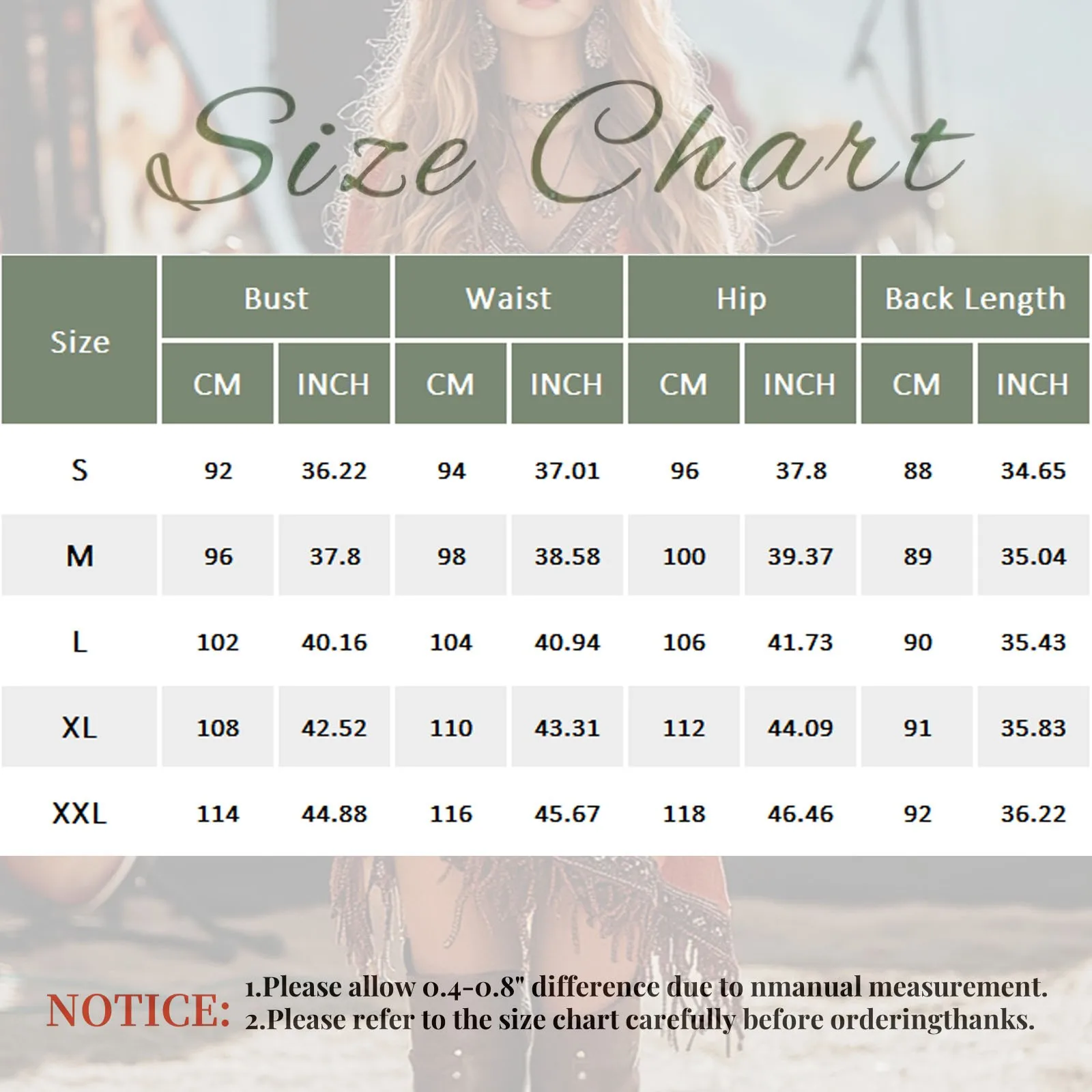 | Size | Bust | Waist | Hip | Shoulder | Sleeve | Back Length |