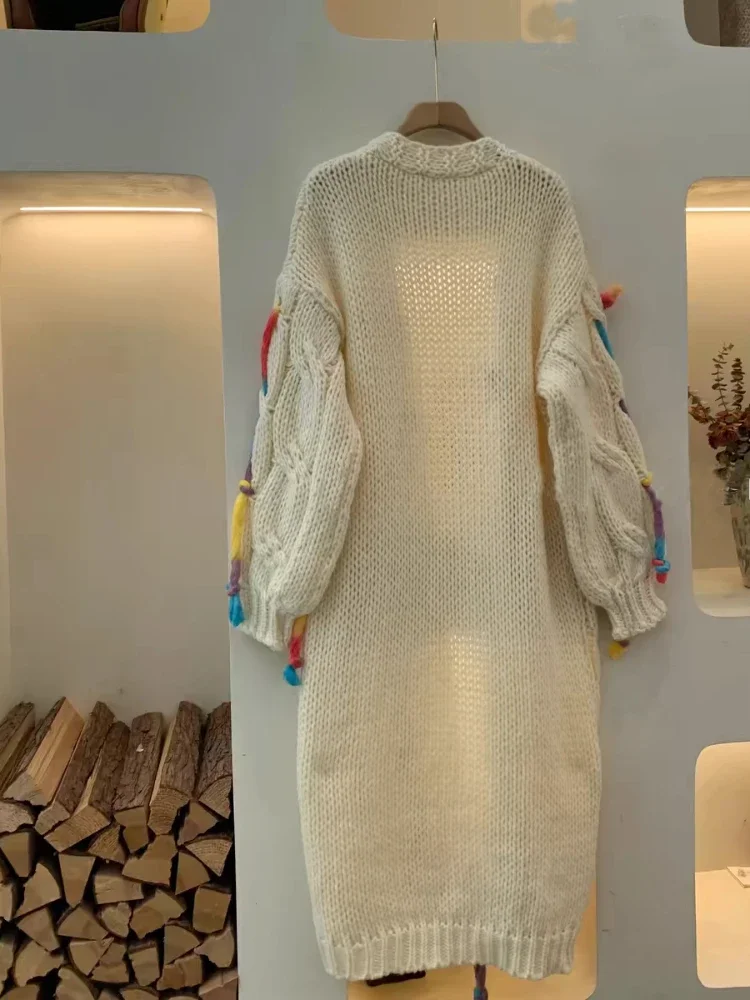 Bring a pop of color and creativity to your wardrobe with this hand-knitted long cardigan. Featuring unique rainbow yarn details woven through the chunky knit texture, this piece blends boho charm and cozy warmth perfectly. The loose fit and open front design make it easy to layer over any outfit, from jeans to dresses, ideal for fall and winter seasons.
