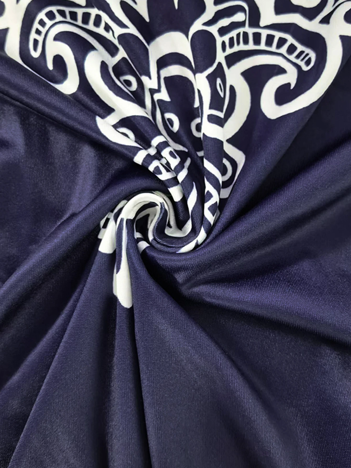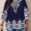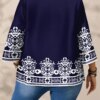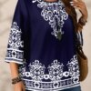 Plus Size Women’s Boho Print T – Shirt, Navy Blue with White Floral Patterns, 3/4 Sleeves, Super Comfy for Daily Casual Wear
