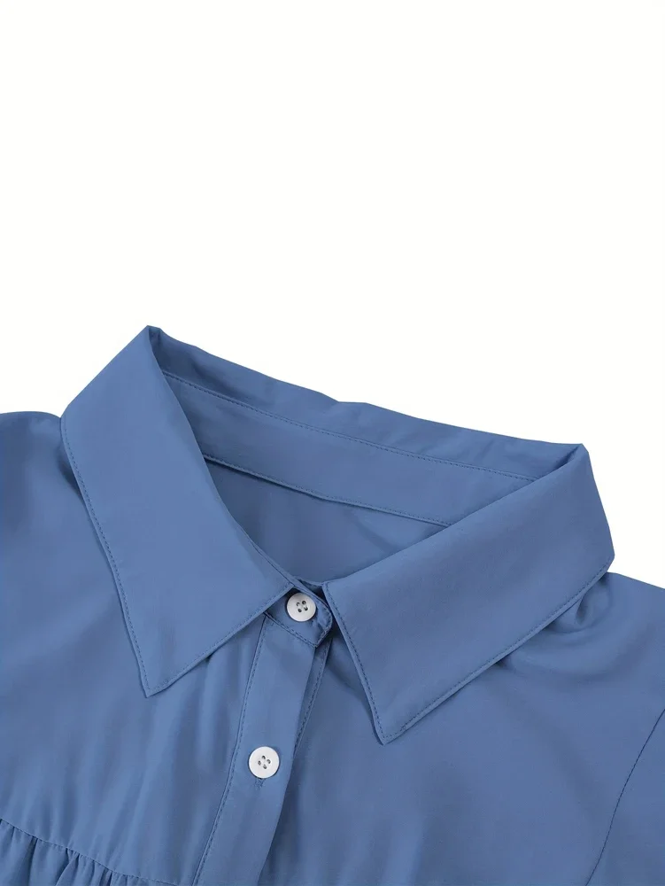 The classic peplum collar adds a feminine touch, making it suitable for both casual and semi-formal occasions.