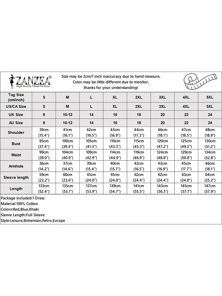 Material:100% Cotton Colors:Red,Blue,Khaki Sleeve Length:Full Sleeve Neckline:O-Neck Pattern:Printing,Random Prints Length:Ankle Length Buckle chain:Button Down Front Thickness:Thin Decoration:Side Pockets Style:Leisure,Bohemian,Retro,Europe Season:Spring,Summer,Autumn,Winter Occasion:Family,Party,Beach,Wedding,Holiday,Employment Label: Yes Attentions: 1.The Real Object May Exist Slightly Colors Differences Compared To Images As Different Computers Display.Caution If Minding,Thanks. 2.There Might Be A Manual Measuring 1-3 cm Error.Sorry For Any Inconvenience. 3.Please Prevail On Real Item, Model Images For Reference Only. 4.Attention!!!Please check the size chart carefully before placing the order.