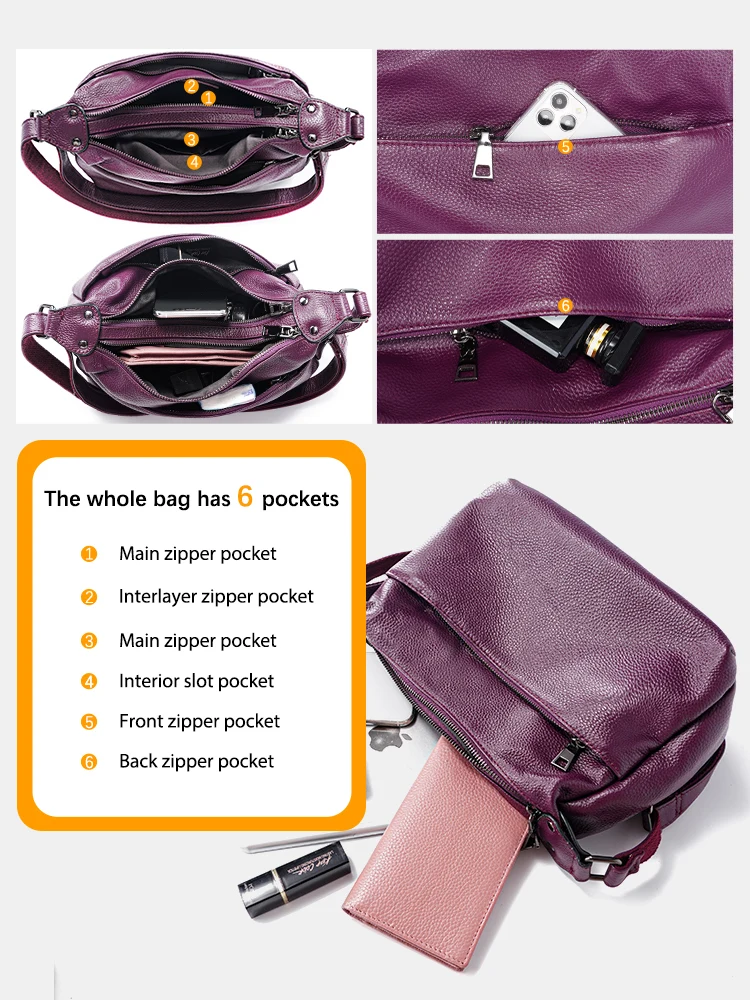 Structure: 1 main zipper pocket,1 interlayer zipper pockets, 1 inside slot pocket, 1 back zipper pocket, 1 front zipper pocket